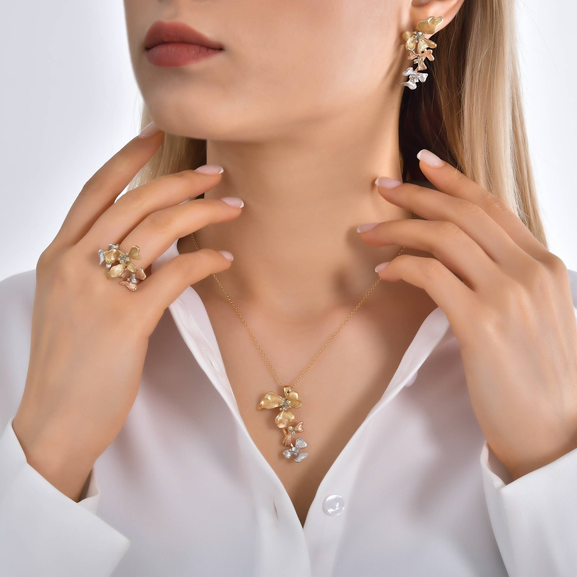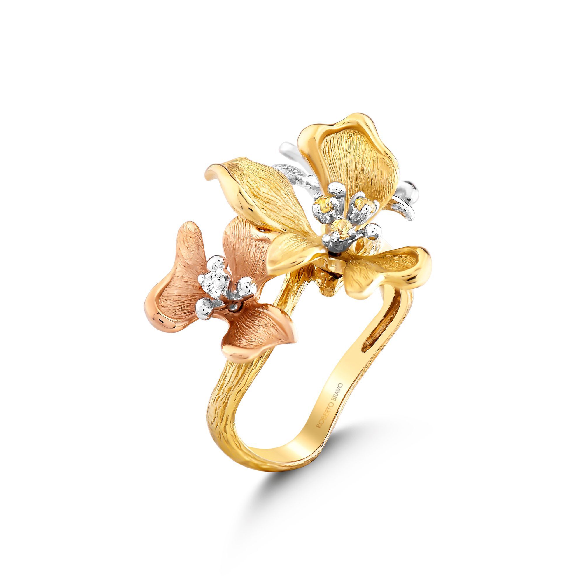 Roberto Bravo, Kareena Koleksiyonu"na ait çiçek formlu yüzük, küpe, kolye ve bilklikler ile kadınların zarif dünyasını yansıtıyor. Tasarımda kullanılan her bir çiçek, kadının gün içinde yaşadığı farklı dünyaları temsil ederken, çiçekler üzerinde bulunan pırlanta ve safir taşlar ise kadının doğal zenginliğini simgeliyor. Pembe, sarı ve beyaz altının muhteşem uyumu ile tasarlanan set, sade ve zarif çizgileri bir arada barındırıyor. Her kıyafetle rahatça kombin edilebilen kolye, küpe ve yüzüğü set olarak kullanabileceğiniz gibi ayrı ayrı da kullanarak şık bir görüntü yaratabilirsiniz. Pırlanta, safir ve altının mükemmel birlikteliğini yansıtan "Kareena Koleksiyonu" ile kendinizi özel hissedeceksiniz