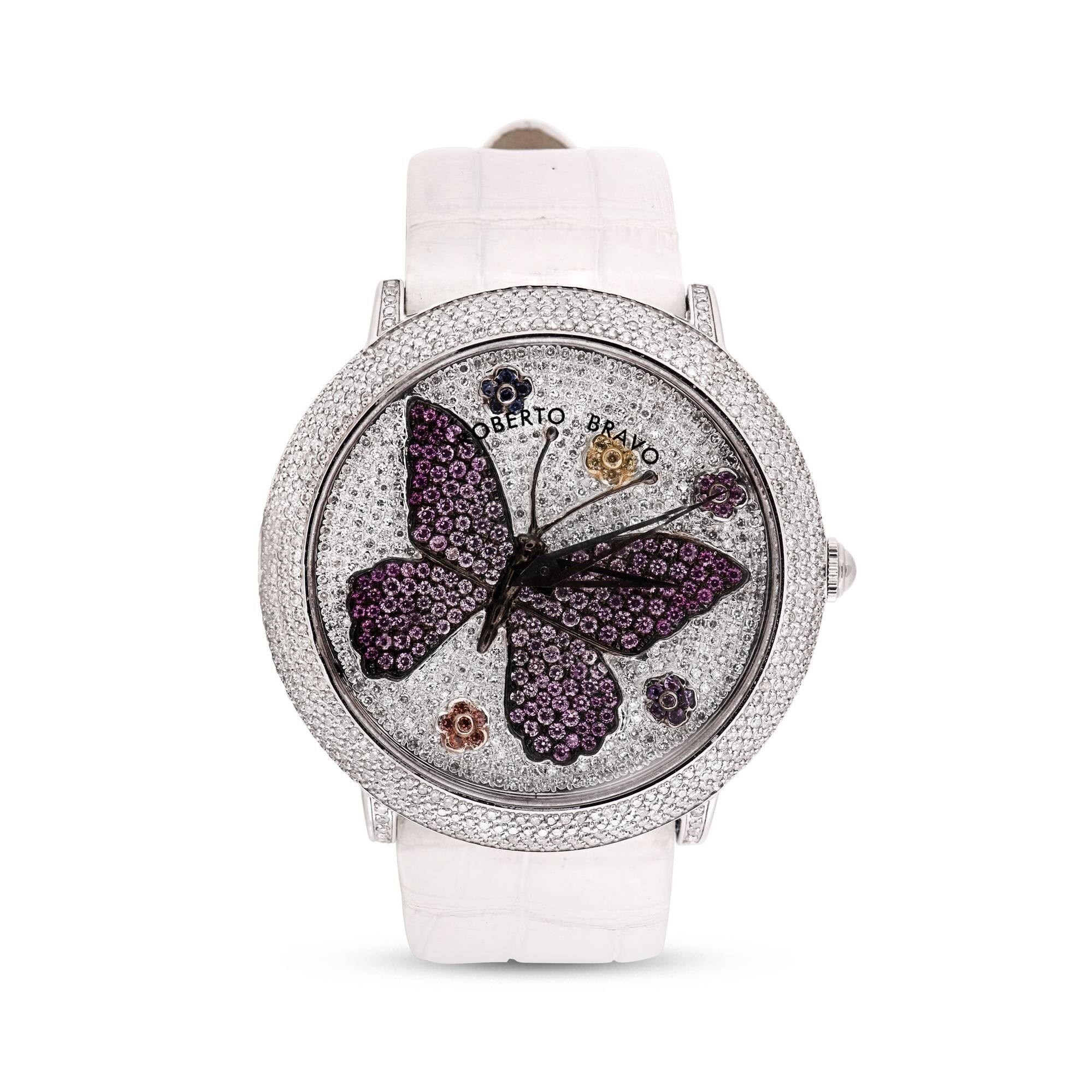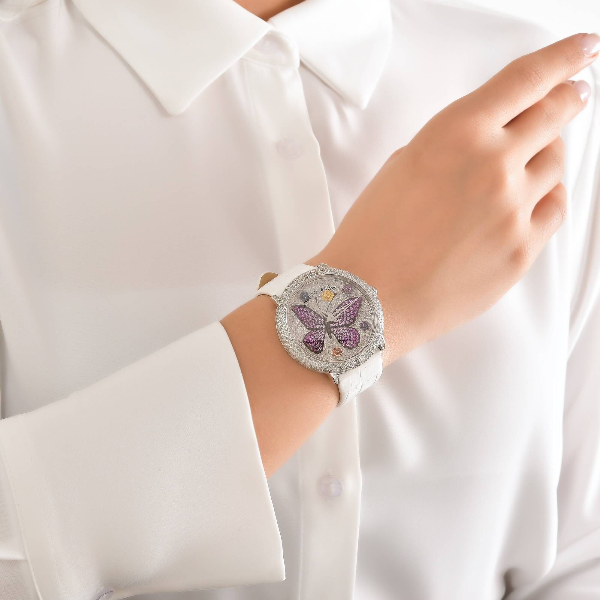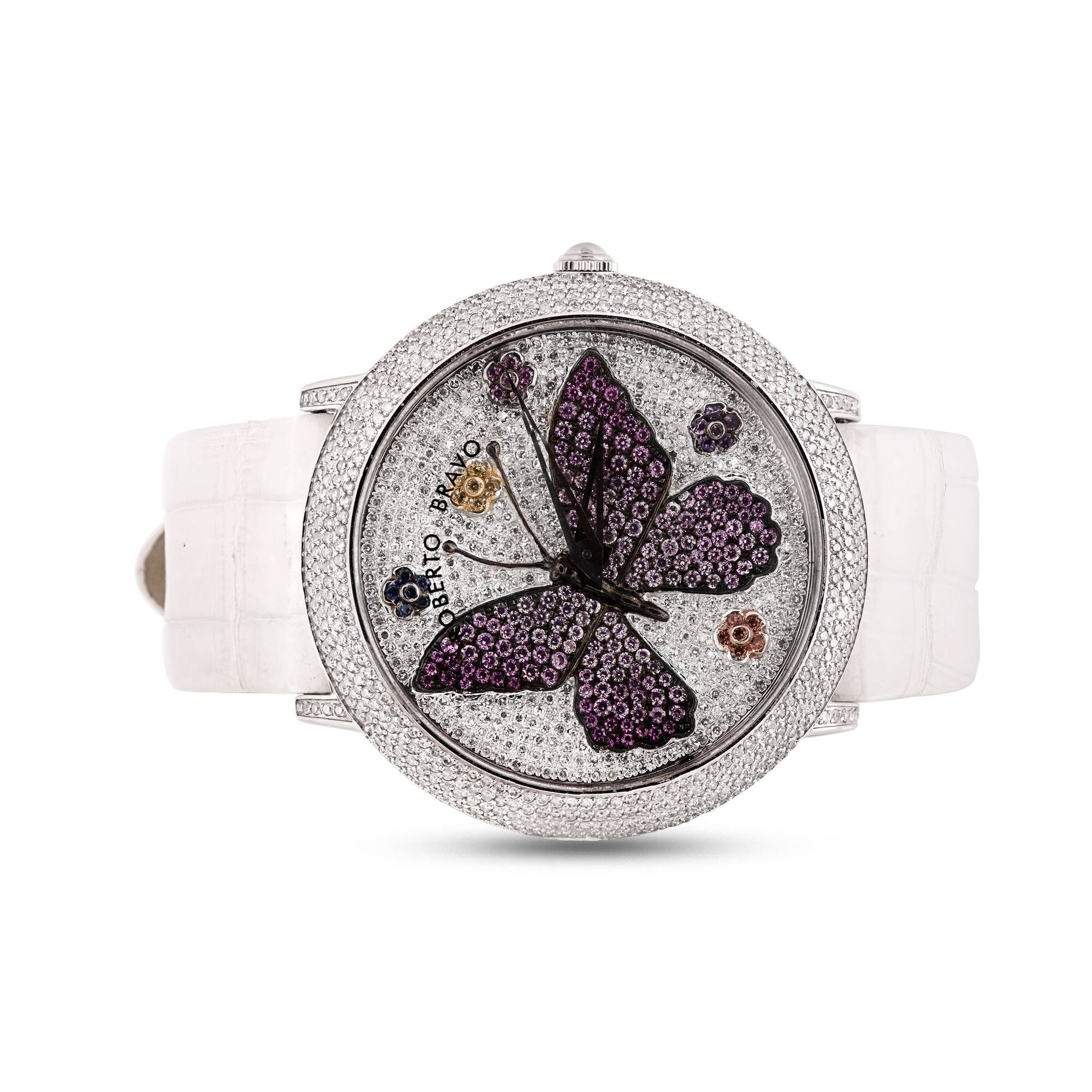 Estetik görünümü ve dakikliğin yanı sıra Roberto Bravo, egzotik taşlar ve elmaslarla kaplı özel saatlerle büyünüzün kağnağı olur.