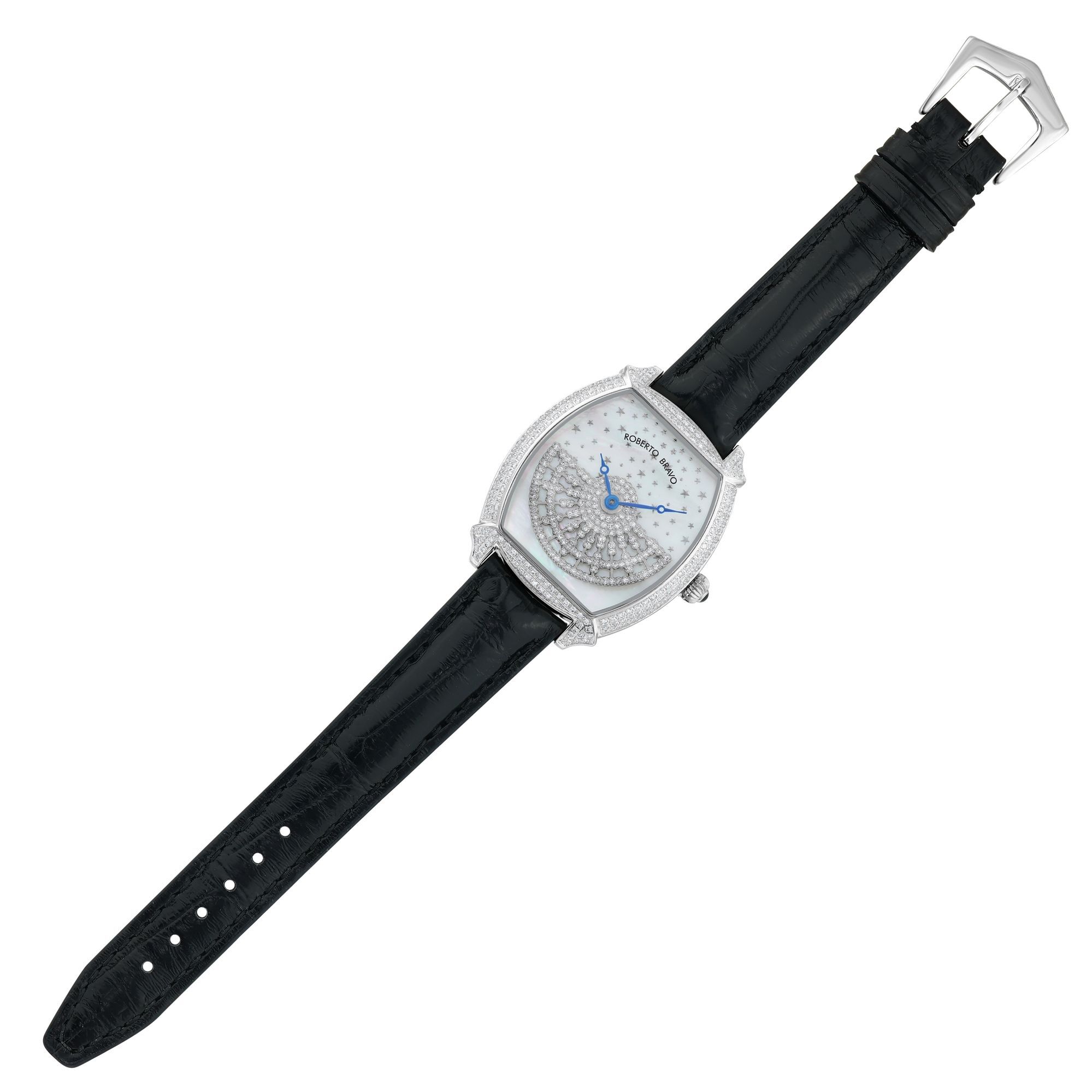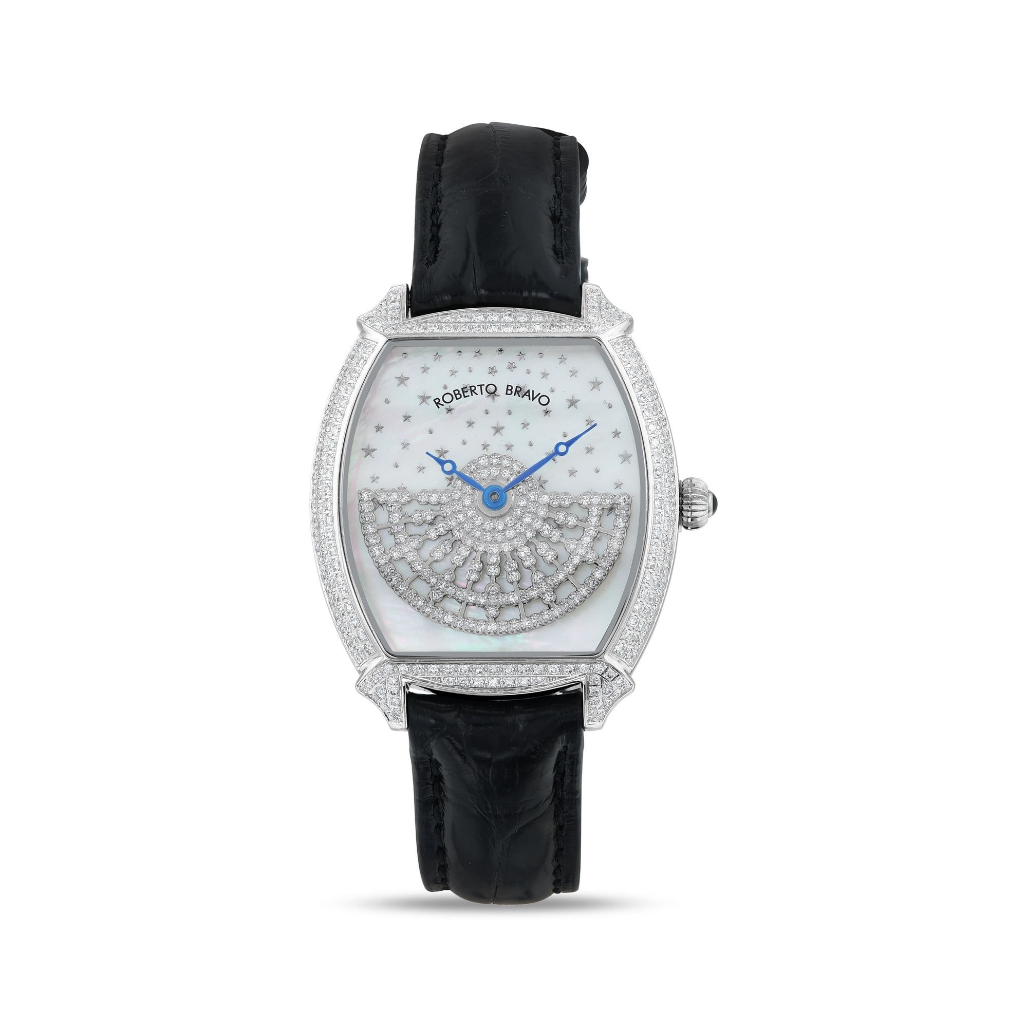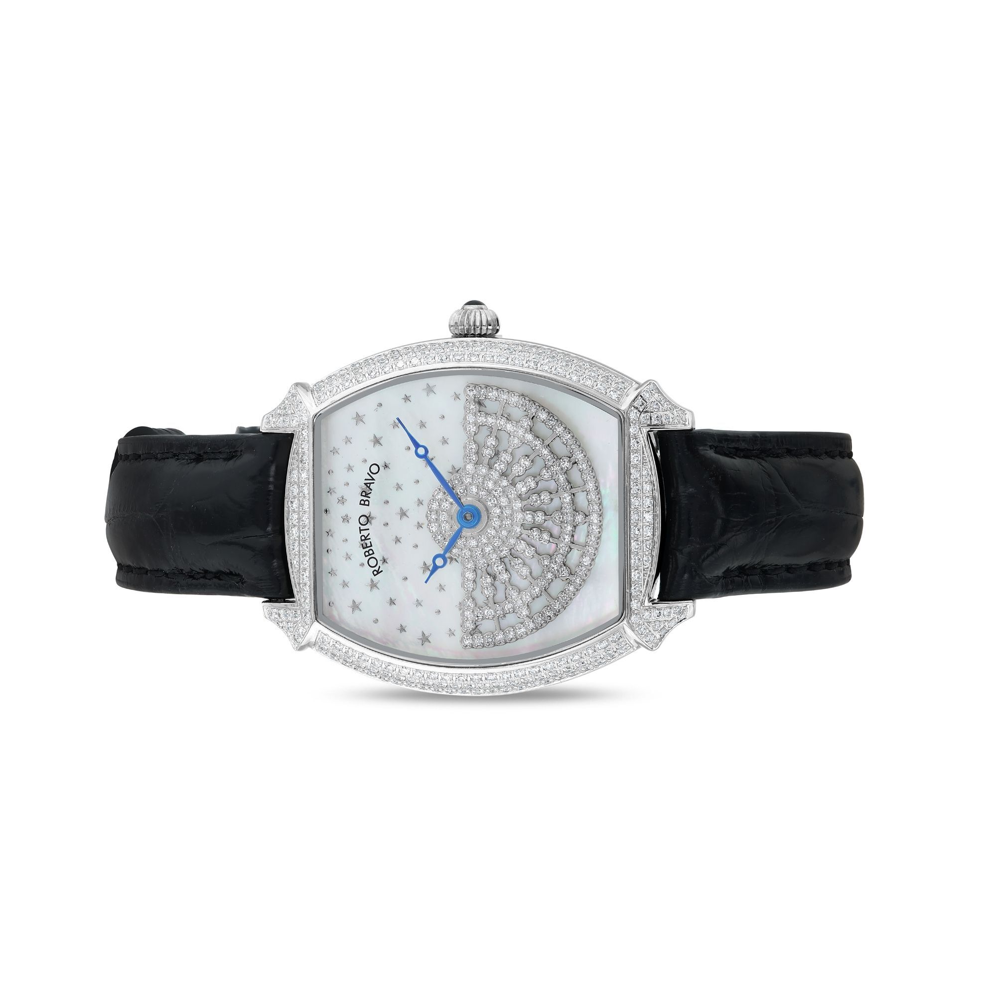 Estetik görünümü ve dakikliğin yanı sıra Roberto Bravo, egzotik taşlar ve elmaslarla kaplı özel saatlerle büyünüzün kağnağı olur.