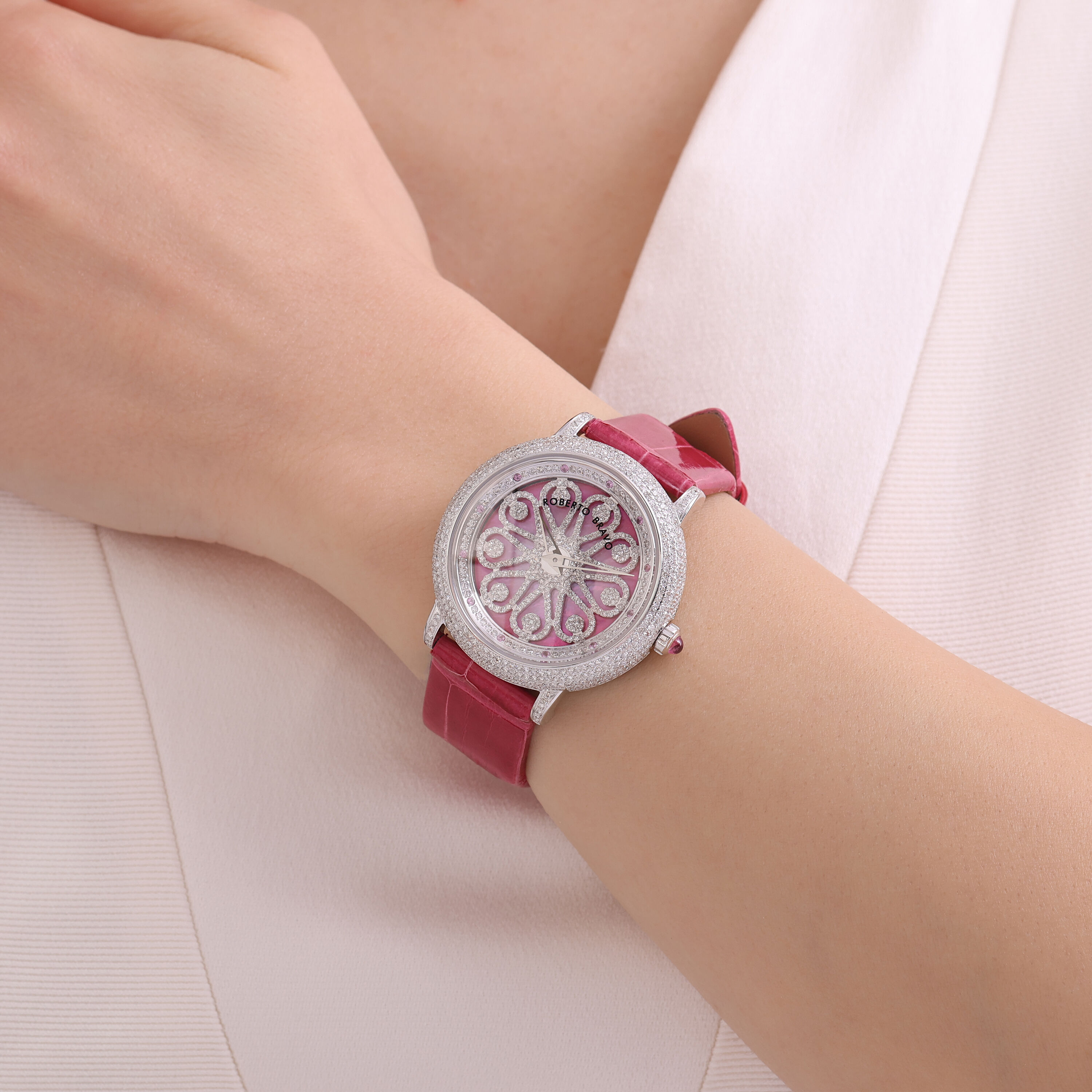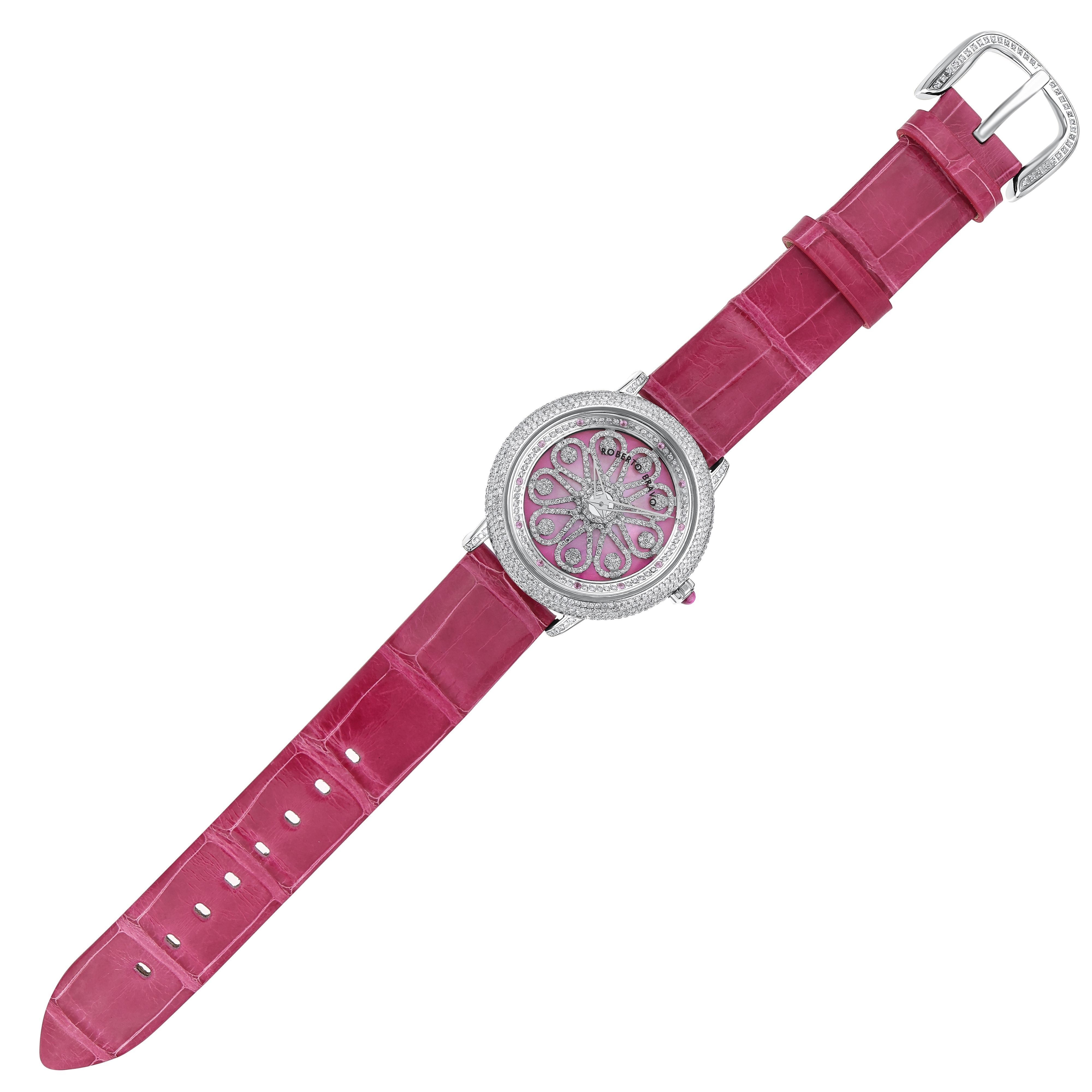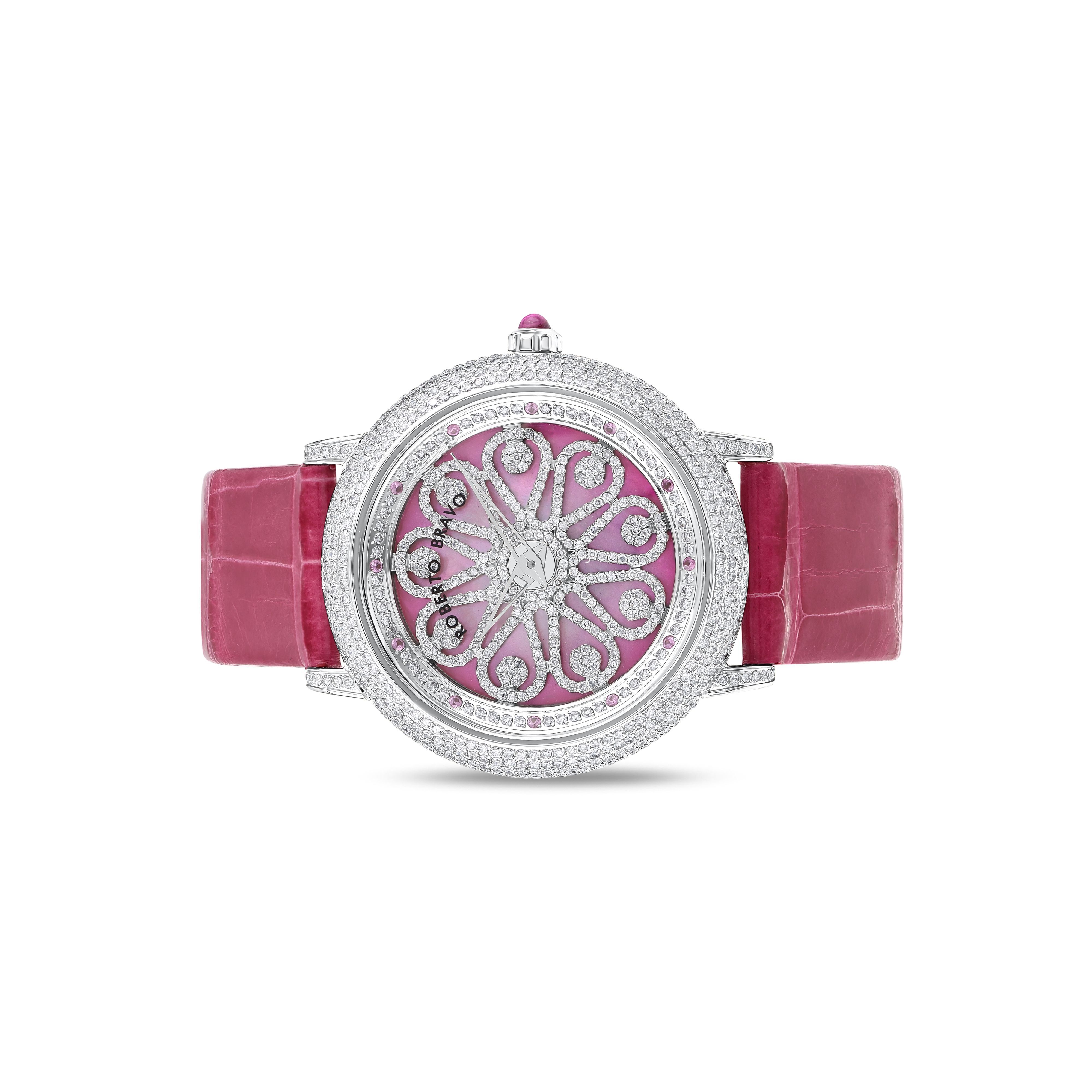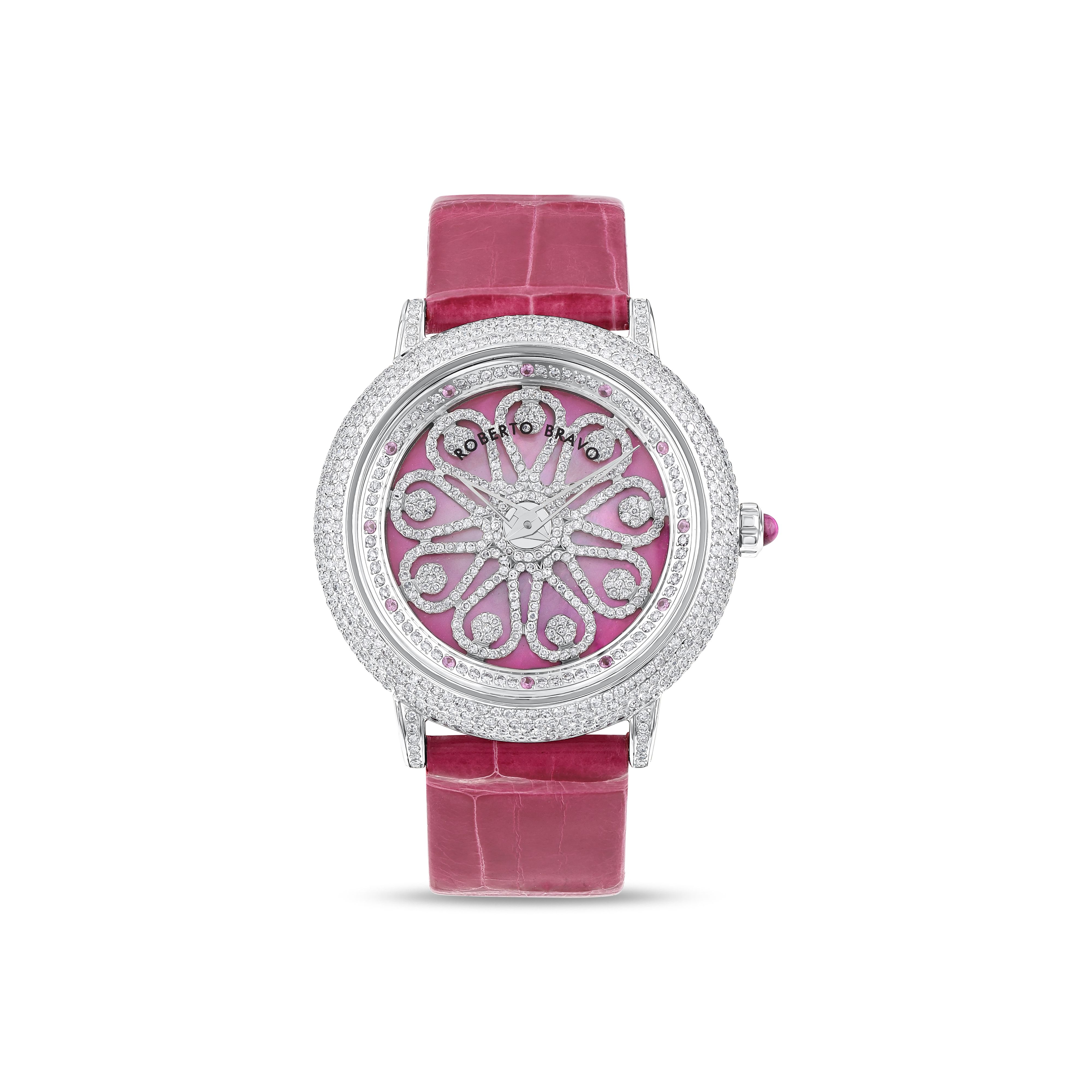 Estetik görünümü ve dakikliğin yanı sıra Roberto Bravo, egzotik taşlar ve elmaslarla kaplı özel saatlerle büyünüzün kağnağı olur.