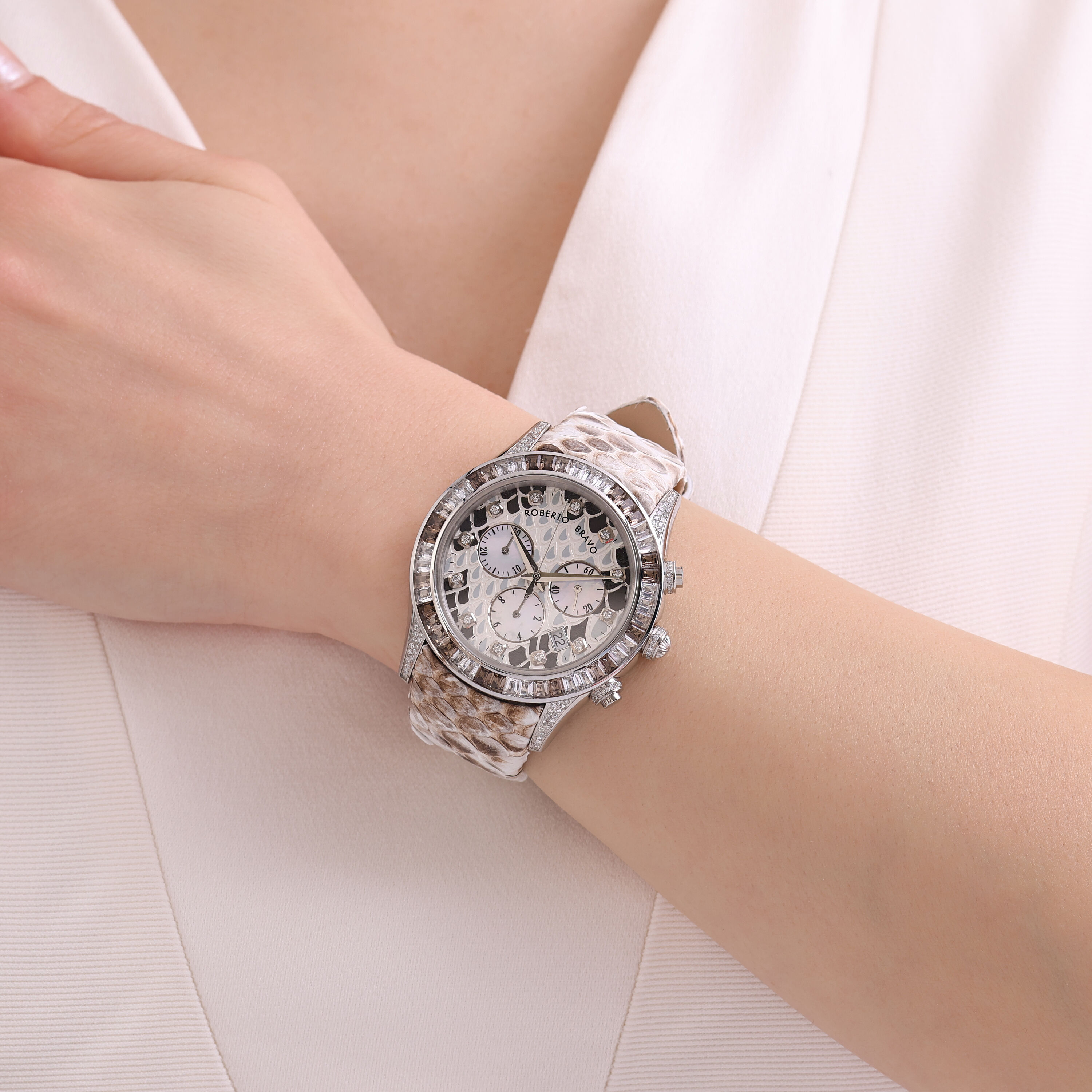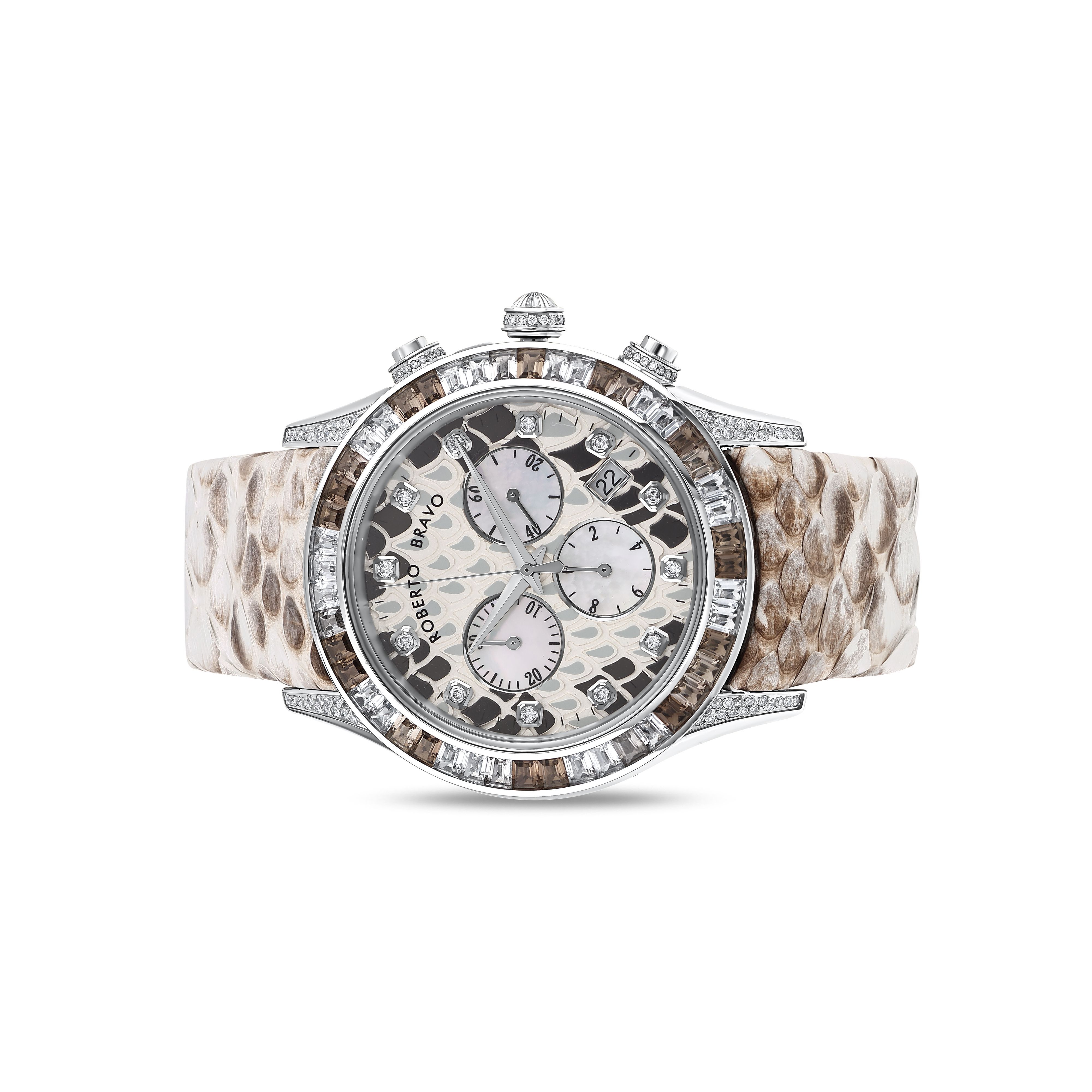 Estetik görünümü ve dakikliğin yanı sıra Roberto Bravo, egzotik taşlar ve elmaslarla kaplı özel saatlerle büyünüzün kağnağı olur.