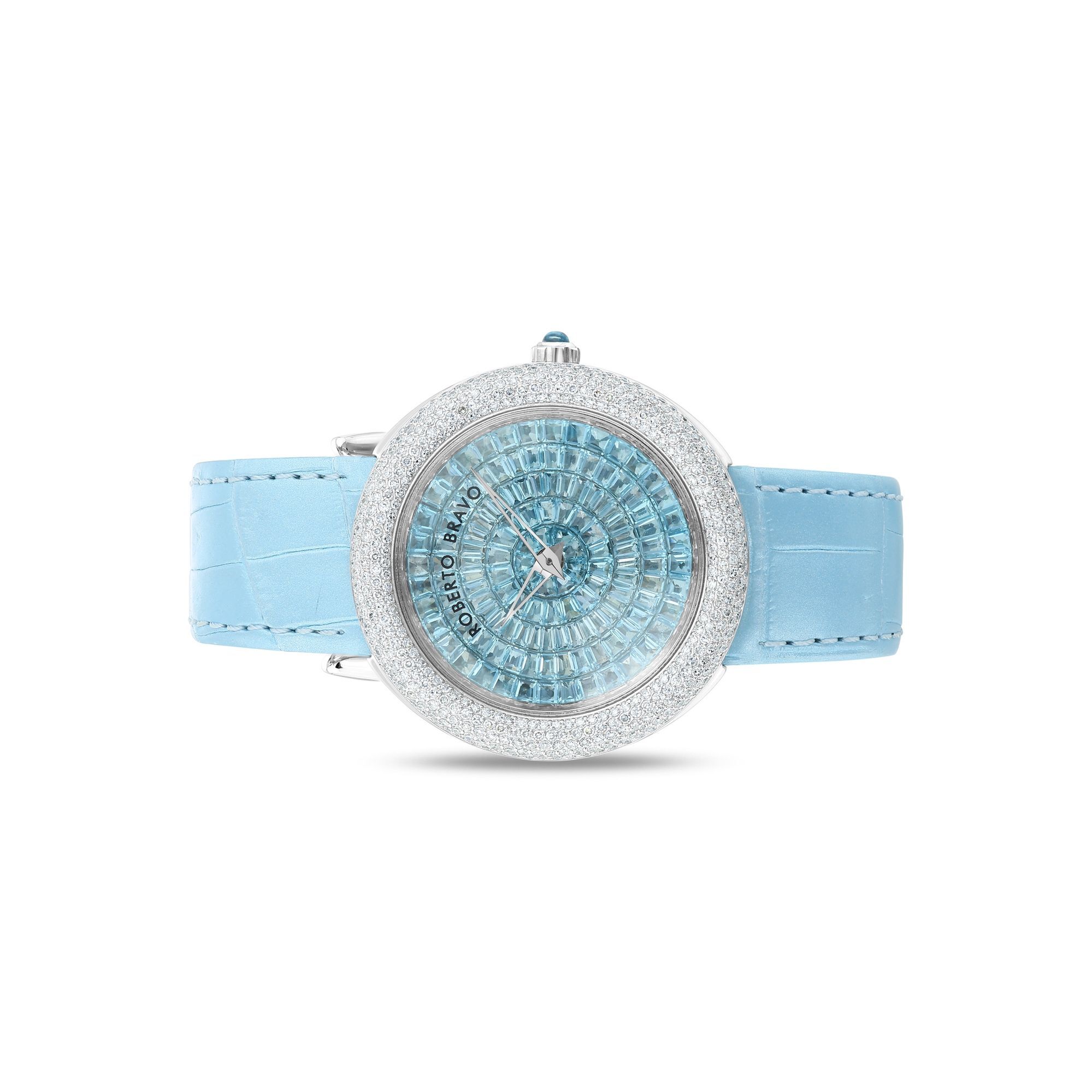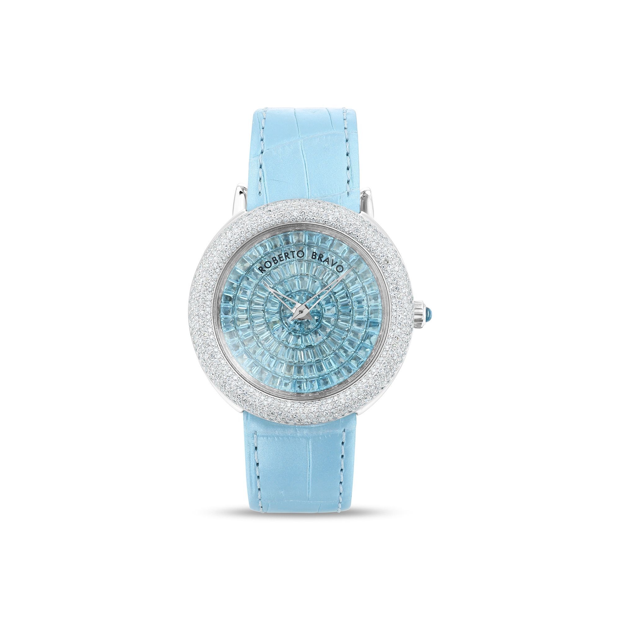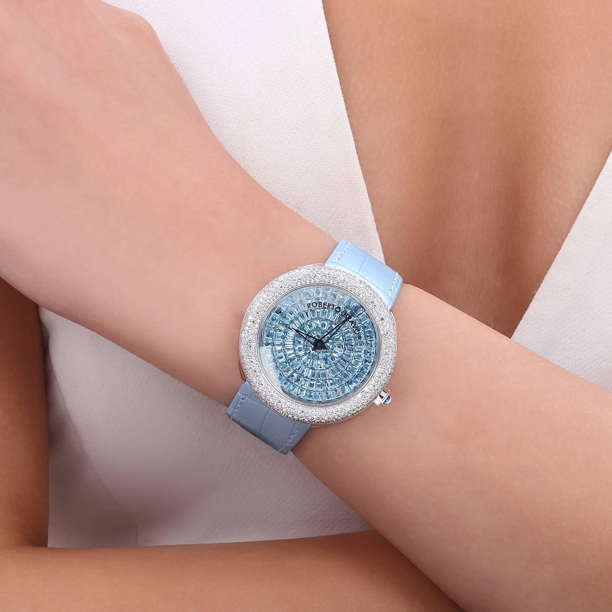 Estetik görünümü ve dakikliğin yanı sıra Roberto Bravo, egzotik taşlar ve elmaslarla kaplı özel saatlerle büyünüzün kağnağı olur.