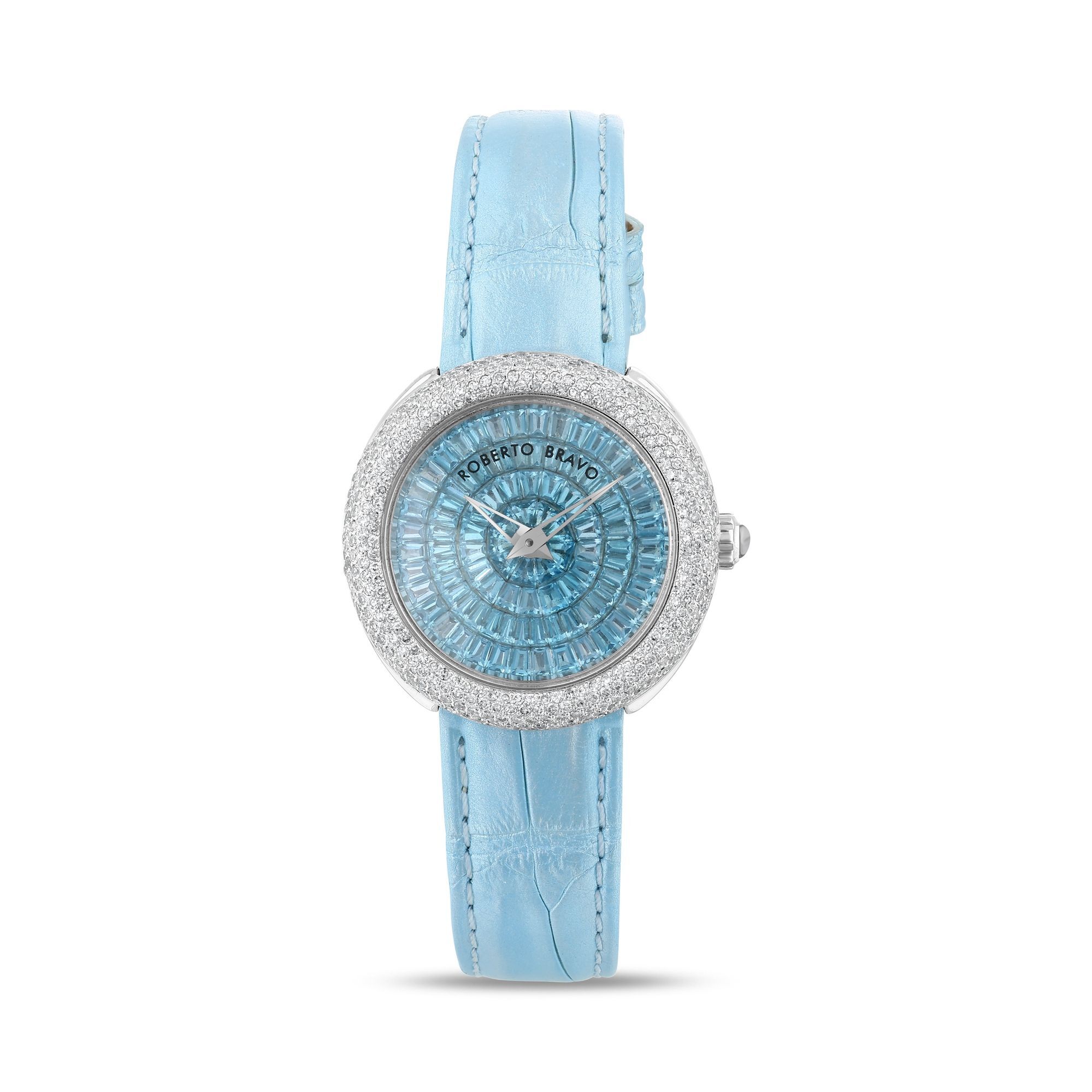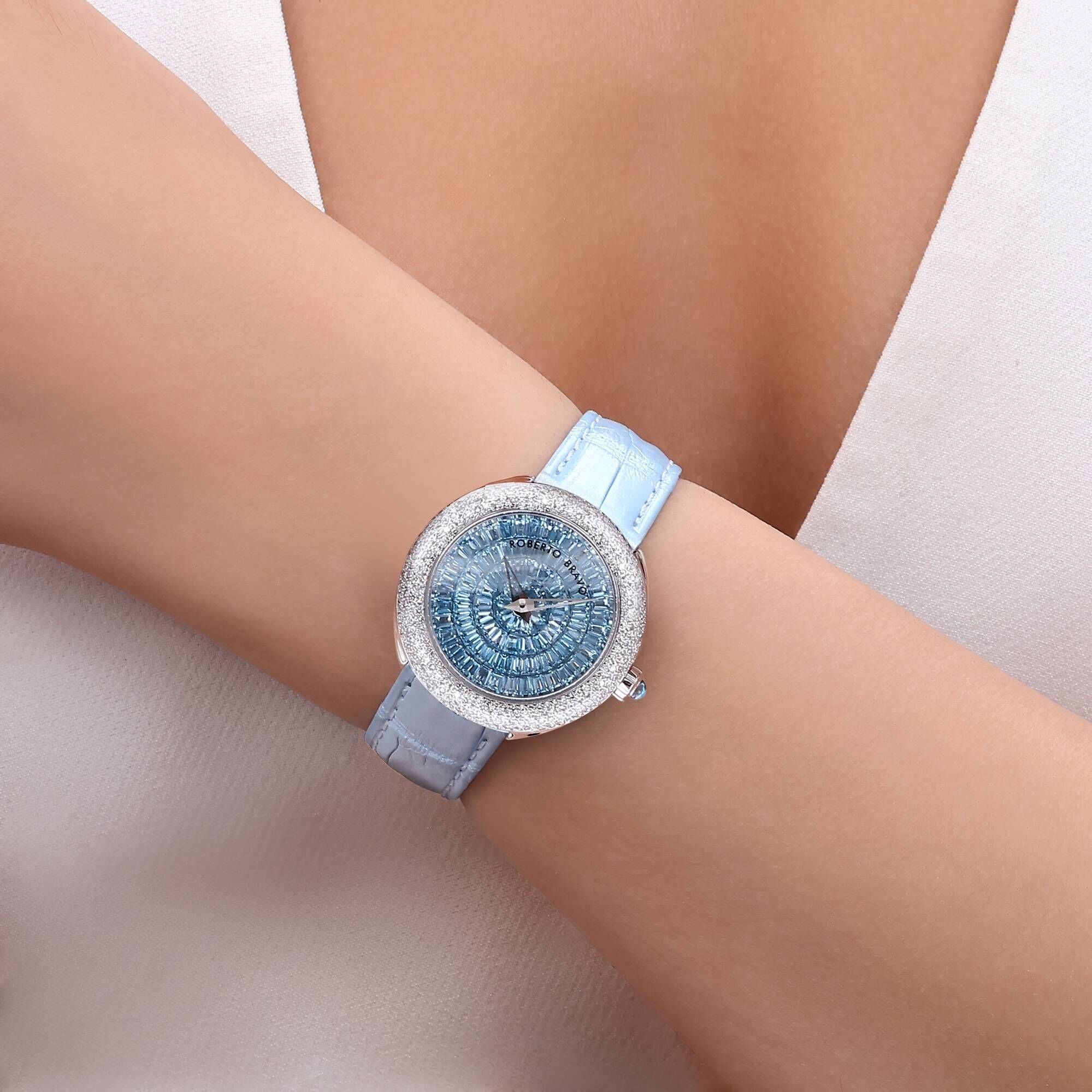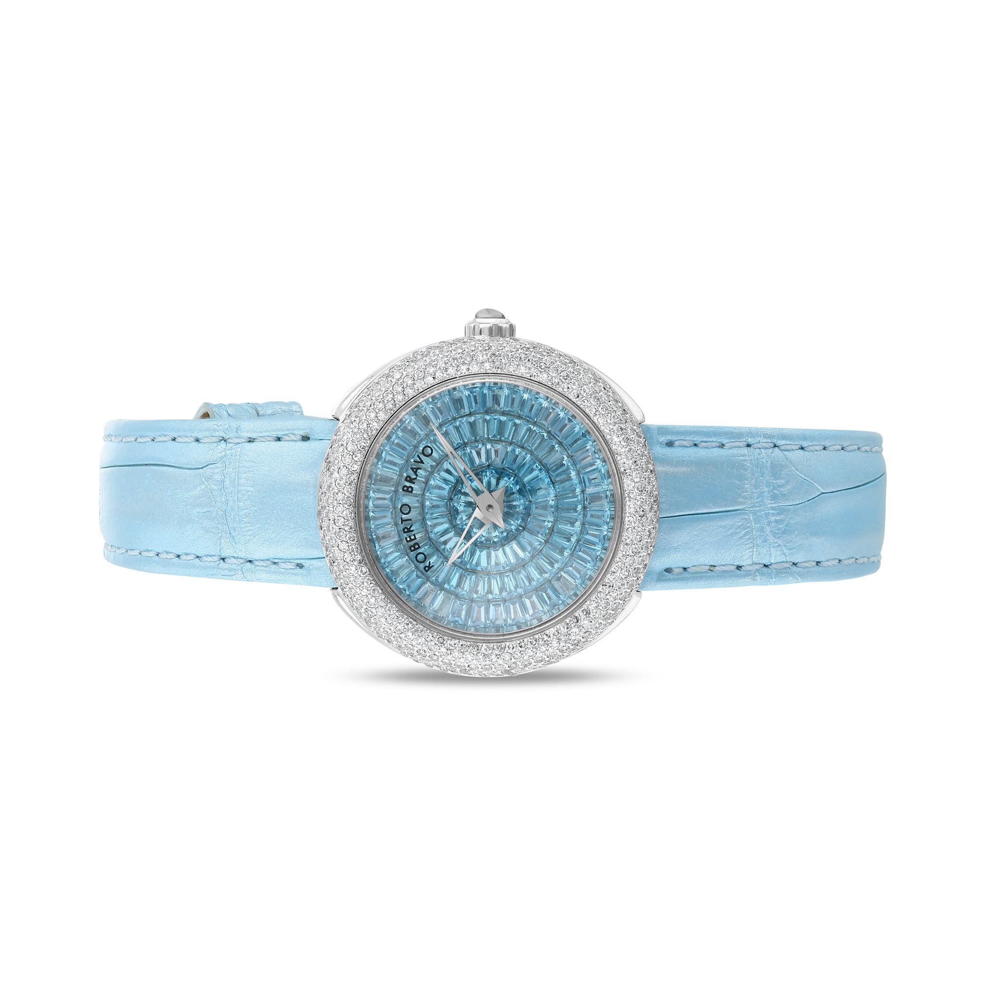 Estetik görünümü ve dakikliğin yanı sıra Roberto Bravo, egzotik taşlar ve elmaslarla kaplı özel saatlerle büyünüzün kağnağı olur.
