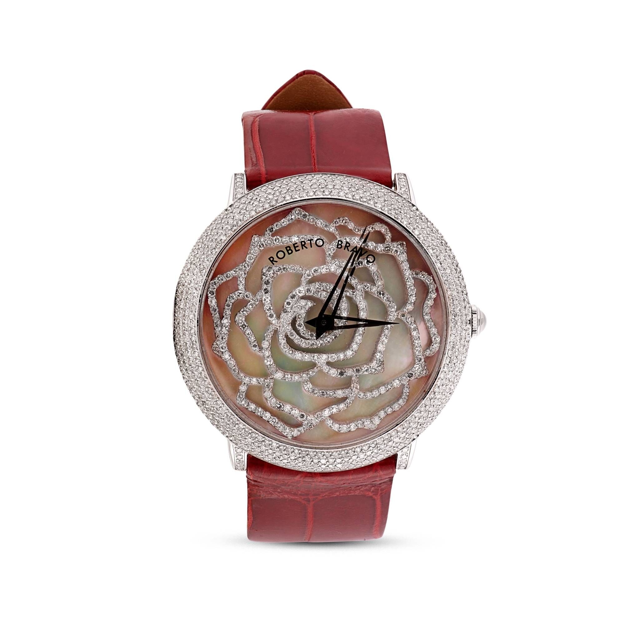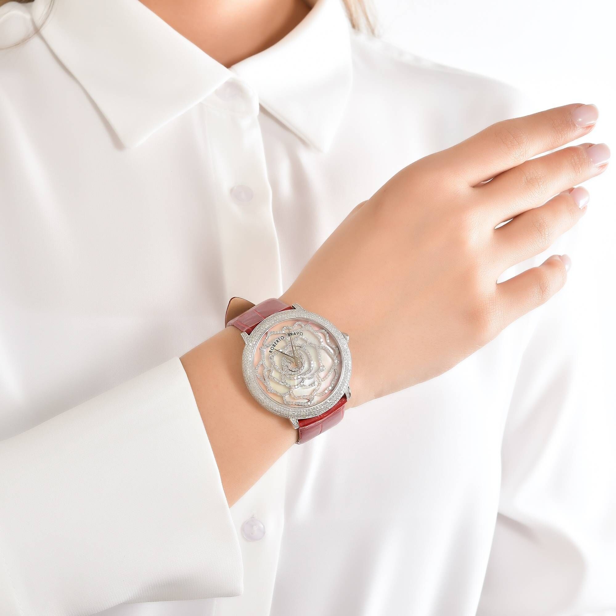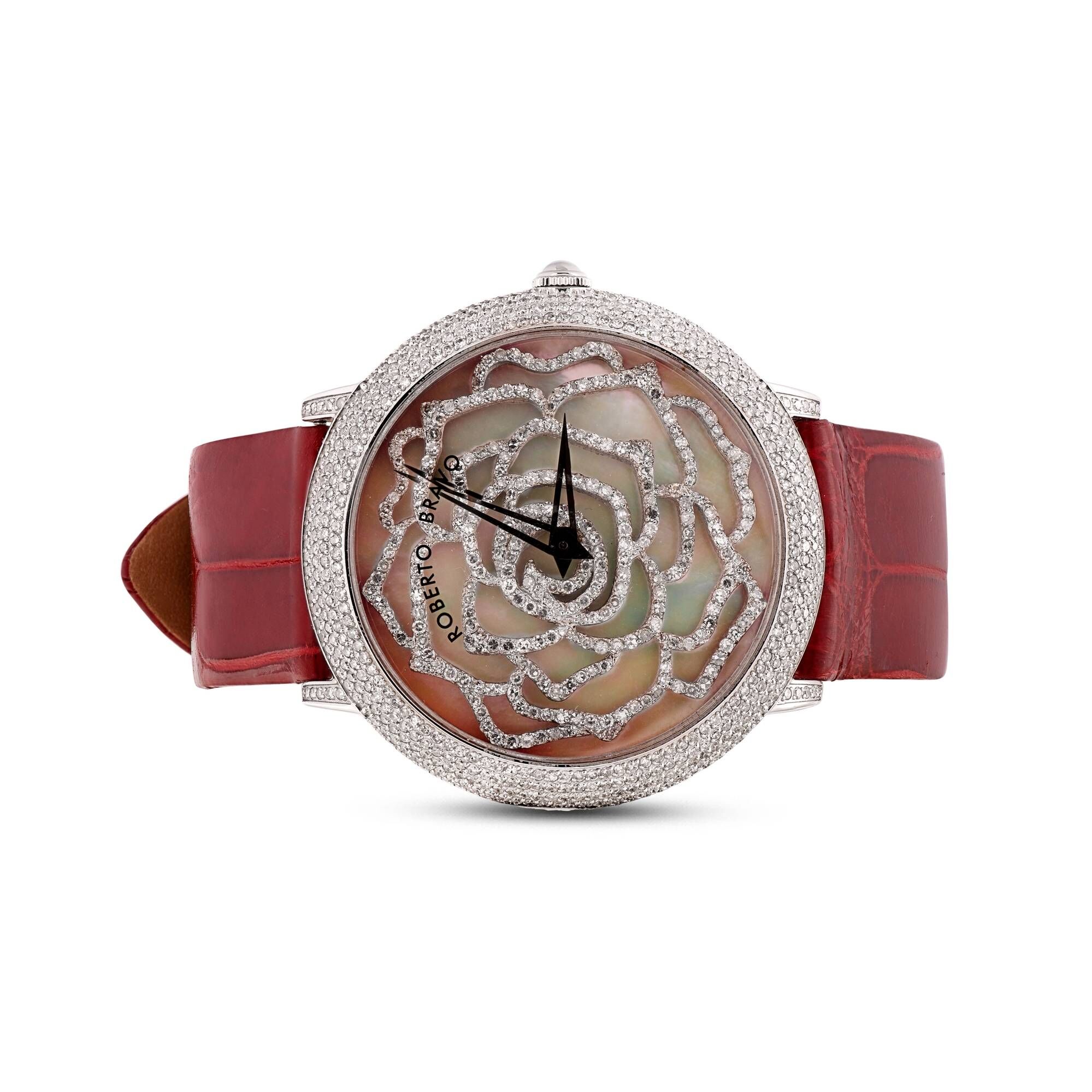Estetik görünümü ve dakikliğin yanı sıra Roberto Bravo, egzotik taşlar ve elmaslarla kaplı özel saatlerle büyünüzün kağnağı olur.